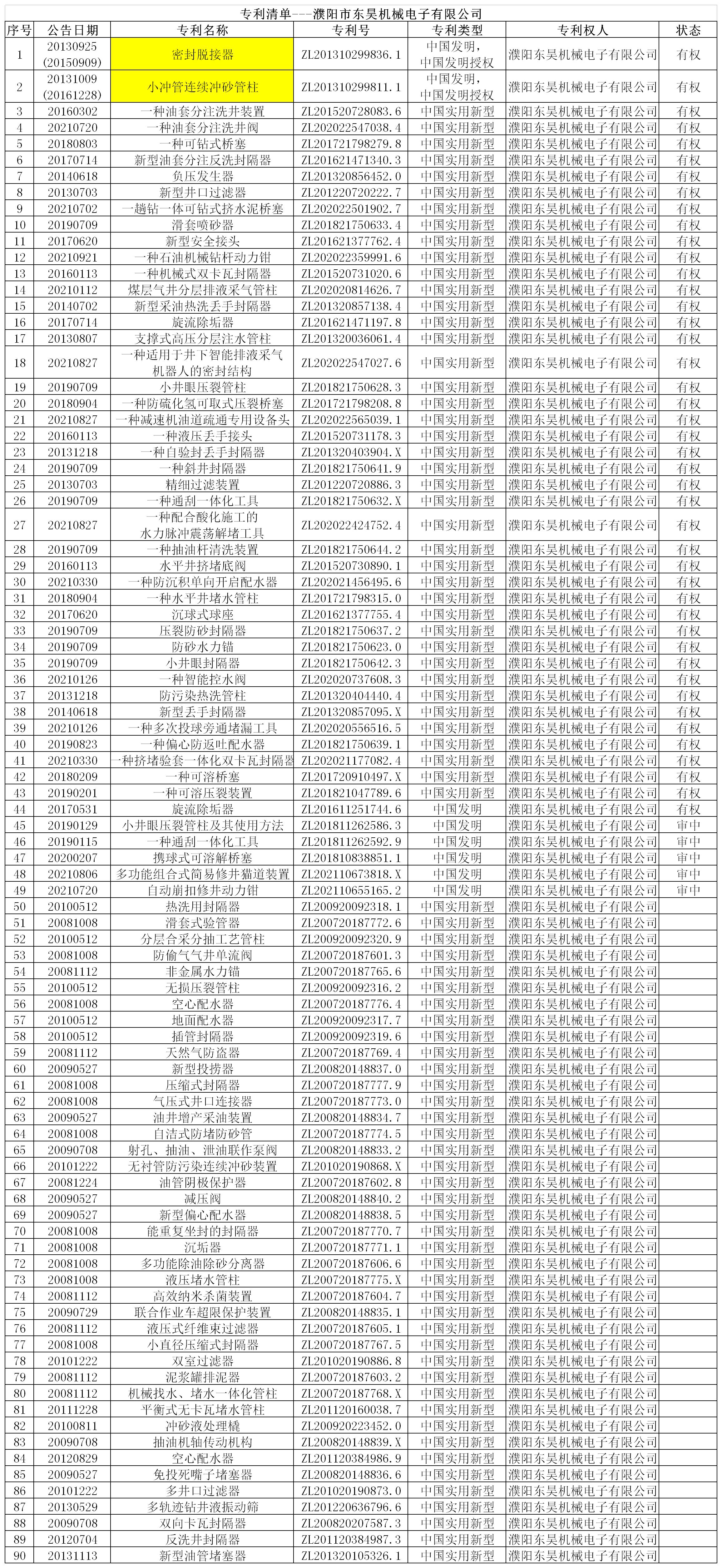 东昊公司专利成果一览表