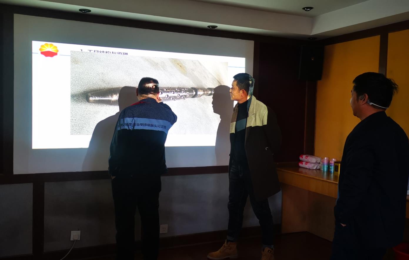 采油二厂工程地质研究所人员对工具提出了疑问,工具研究发明人马永生一一做出了回复和解释,最终东昊公司套管液压整形工具的前端性能和工艺的安全性能赢得了采油厂工具所的赞同,现场分析了一口套管变形井况,并讨论了整形施工方案。